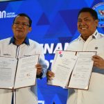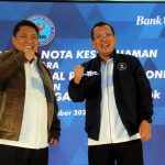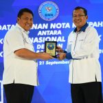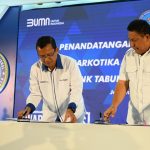 Direktur Utama PT Bank Tabungan Negara (Persero) Tbk. Haru Koesmahargyo bersama Kepala Badan Narkotika Nasional Komjen Pol Petrus R. Golose menunjukkan naskah Nota Kesepahaman di Menara BTN, Jakarta, Rabu (21/9). Bank BTN siap memberikan berbagai layanan jasa perbankan untuk mendukung dan mempermudah operasional satuan kerja BNN. Bank BTN juga ikut menggelar pelaksanaan tes narkoba bagi pegawai BTN dalam rangka mendukung pencegahan penyalahgunaan narkoba.