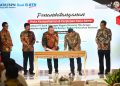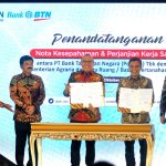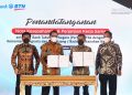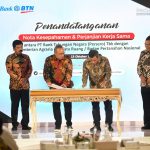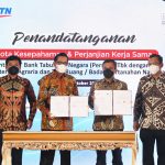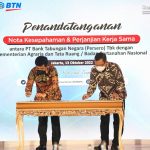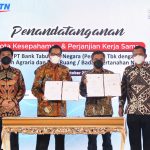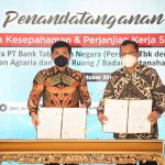 Menteri Agraria dan Tata Ruang/Badan Pertanahan Nasional (ATR/BPN) Hadi Tjahjanto (tengah) didampingi Direktur Jenderal Penetapan Hak dan Pendaftaran Tanah (PHPT), Suyus Windayana (kiri) , Sekretaris Jenderal Kementerian ATR/BPN, Himawan Arief Sugoto (kedua dari kiri) bersama Direktur Utama Bank BTN Haru Koesmahargyo (kedua dari kanan) dan Wakil Direktur Utama Bank BTN Nixon LP Napitupulu (kanan) berfoto bersama usai penandatanganan Nota Kesepahaman tentang Sinergi Tugas dan Fungsi Bidang Agraria/Pertanahan dan Tata Ruang serta Jasa dan Layanan Perbankan di Jakarta, Kamis (13/10). Dalam rangka mendukung upaya pemerintah mencapai target penerbitan 126 juta sertifikat terutama untuk penyediaan rumah bagi rakyat, Kementerian ATR BPN bersama Bank BTN menggelar kemitraan strategis terkait sertifikat tanah. Kerja sama tersebut ditargetkan mempercepat proses penyelesaian sertifikat milik debitur serta calon debitur Bank BTN terutama dalam mendukung kesuksesan Program Satu Juta Rumah.