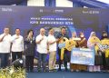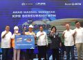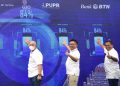 Direktur Consumer Bank BTN Hirwandi Gafar (kanan) bersama Direktur Jenderal Pembiayaan Infrastruktur Pekerjaan Umum dan Perumahan, Kementerian PUPR RI, Herry Trisaputra Zuna (kiri) serta Deputi Komisioner Bidang Pemanfaatan Dana Tapera, BP Tapera Ariev Baginda Siregar (tengah) secara simbolis menekan layar tanda dimulainya acara akad massal serentak KPR subsidi dalam rangkaian One Stop Housing Solution BTN di Maros, Sulawesi Selatan, Sabtu (23/7). Gelaran acara akad massal KPR Subsidi BTN yang diikuti oleh lebih dari 10.000 debitur di seluruh Indonesia merupakan strategi Bank BTN untuk mempercepat penyaluran KPR Subsidi (FLPP) yang ditargetkan dapat menembus 200.000 unit pada tahun 2022.