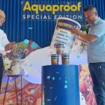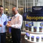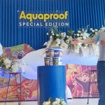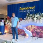 GM Commerce PT Adhi Cakra Utama Mulia (Aquaproof) Antony Kostka (kiri) berbincang dengan Founder Aquaproof Herman Moeliana (kanan) saat acara peluncuran Aquaproof Spesial Edition di Jakarta, Ahad (13/8/2023). Aquaproof sebagai pelopor cat pelapis anti bocor di usianya yang lebih dari 35 tahun meluncurkan tiga design packaging menarik hasil dari Aquaproof Packaging Contest dengan tema “Rumah & Budaya Indonesia”.