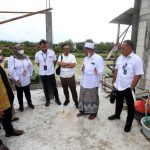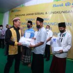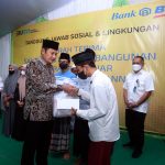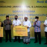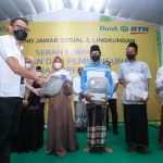 Corporate Secretary Bank BTN Ari Kurniaman (ketiga dari kiri) menyerahkan bantuan pembangunan warung d’kios secara simbolis kepada Pengasuh Ponpes Raudhatul Jannah, Chafid Junaidi (tiga dari kanan) disaksikan oleh Bupati Lamongan Yuhronur Efendi (kedua dari kiri) dan Asisten Deputi Bidang Jasa Keuangan Kementerian BUMN Muhammad Khoerur Roziqin (kiri) di Pondok Pesantren Roudhotul Jannah, Lamongan, Jawa Timur, Kamis (21/4/2022). Pemberian santunan sekaligus bantuan pembangunan gedung sarana belajar tersebut merupakan tunggung jawab sosial dan lingkungan dari Bank BTN sebagai komitmen terhadap kemajuan dunia pendidikan khususnya pesantren.
