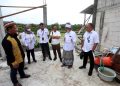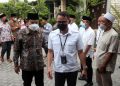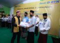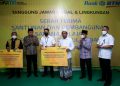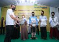Corporate Secretary Bank BTN Ari Kurniaman (ketiga dari kiri) menyerahkan bantuan pembangunan warung d’kios secara simbolis kepada Pengasuh Ponpes Raudhatul Jannah, Chafid Junaidi (tiga dari kanan) disaksikan oleh Bupati Lamongan Yuhronur Efendi (kedua dari kiri) dan Asisten Deputi Bidang Jasa Keuangan Kementerian BUMN Muhammad Khoerur Roziqin (kiri) di Pondok Pesantren Roudhotul Jannah, Lamongan, Jawa Timur, Kamis (21/4/2022). Pemberian santunan sekaligus bantuan pembangunan gedung sarana belajar tersebut merupakan tunggung jawab sosial dan lingkungan dari Bank BTN sebagai komitmen terhadap kemajuan dunia pendidikan khususnya pesantren.