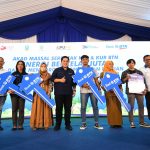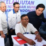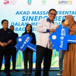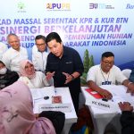 Direktur Utama Bank BTN, Nixon LP Napitupulu disaksikan Menteri BUMN Erick Thohir secara simbolis menyerahkan kunci rumah kepada debitur Bank BTN pada acara Akad Massal Serentak KPR & KUR Bank BTN di Sidoarjo, Jawa Timur, Sabtu (9/9). Akad massal KPR serentak yang digelar Bank BTN merupakan salah satu upaya perseroan untuk melakukan optimalisasi pembiayaan rumah rakyat terus terjaga. Optimalisasi yang dilakukan Bank BTN diharapkan bisa mewujudkan mimpi jutaan rakyat Indonesia memiliki hunian yang layak dan terjangkau.
