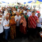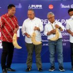 Direktur Jenderal Pembiayaan Infrastruktur Pekerjaan Umum dan Perumahan Herry Trisaputra Zuna (kedua kiri) Wakil Walikota Surakarta Teguh Prakoso (kiri) dan ketua Umum (IKAPPI) Abdullah Mansuri memukul kentongan saat membuka Gerebek Pasar 2022 Bank BTN dan IKKAPPI di Pasar Klewer, Solo, Jawa Tengah, Rabu (9/11). Setelah menggelar Akad Kredit Perdana dengan mitra driver Gojek di Karanganyar, Bank BTN melakukan Grebeg Pasar bersama IKAPPI di Solo dalam rangka sosialisasi penyaluran KPR BP2BT.