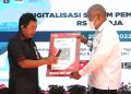 Direktur Teknologi & Operasional Bank DKI, Amirul Wicaksono (kedua dari kiri) menyerahkan QRIS secara simbolis kepada Direktur RSUD Koja, Ida Bagus Nyoman Banjar (kedua dari kanan), disaksikan oleh Sekretaris Kota Jakarta Utara, Abdul Khalit (kiri) dan Wakil Direktur Pelayanan merangkap Plt. Wakil Direktur Umum dan Keuangan RSUD koja, Risma Sari (kanan) di Jakarta Utara (20/4).