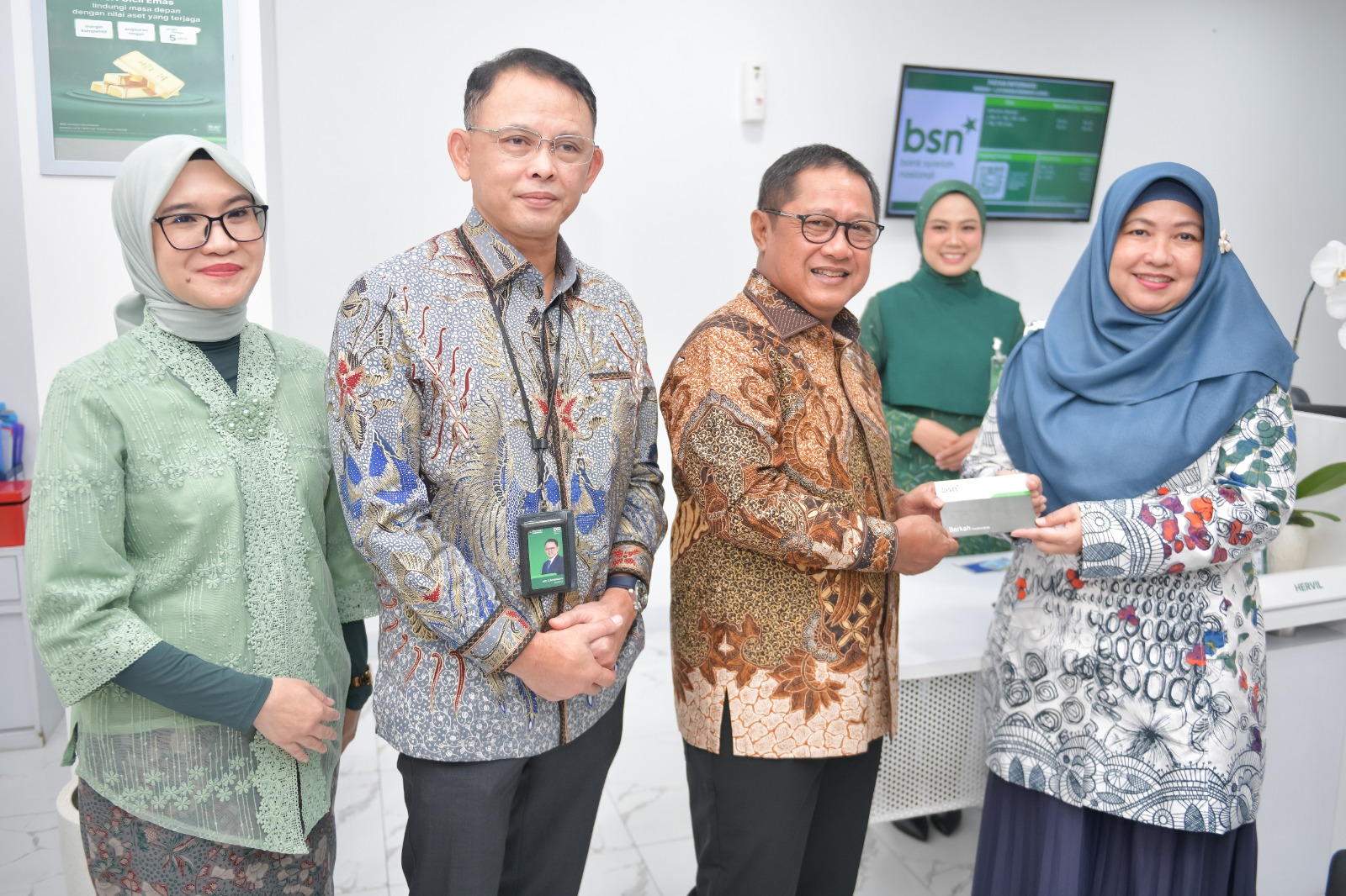 Direktur Utama PT Bank Syariah Nasional Alex Sofjan Noor (tengah) didampingi Direktur Network & Retail Funding BSN Ari Kurniaman (kiri), SEVP BSN Maqin U. Norhadi dan Kepala Cabang BSN Jakarta Harmoni Nurul Astuti berbincang dengan nasabah saat menandai resmi beroperasinya layanan perseroan secara nasional dengan mengunjungi Kantor Cabang BSN Jakarta Harmoni, di Jakarta, Senin (22/12/ 2025). Mengusung visi menjadi mitra utama keuangan keluarga yang berkah dan amanah, BSN optimistis dapat menjadi katalisator di industri perbankan syariah nasional.