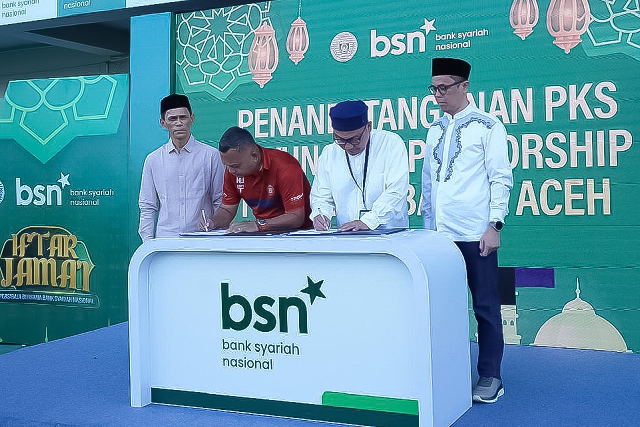 Direktur Risk Management Bank Syariah Nasional (BSN) Beki Kanuwa dan Direktur Keuangan Persiraja Razami Dek Cut menyaksikan penandatanganan kerjasama sponsor club sepak bola di Banda Aceh, Minggu (8/3). Naskah kerjasama sponsor liga 2 tersebut ditandatangani oleh Corporate Secretary BSN Dody Agoeng dan Sekretaris Umum Persiraja Rahmat Jailani. BSN mendukung club sepak bola Persiraja sejalan dengan rencana bisnis perseroan dalam mengembangkan sayap ke serambi Aceh agar lebih dikenal oleh masyarakat Aceh sebagai bank hasil spin off Bank Syariah BTN yang melahirkan Bank Umum Syariah dengan nama Bank Syariah Nasional. Sponsor ini juga dimaksudkan untuk mengajak ekosistem pecinta bola khususnya Persiraja di lingkungan masyarakat Aceh dapat mengakses layanan dan produk BSN selain sebagai dukungan perseroan kepada tumbuhnya olah raga sepak bola di tanah air.