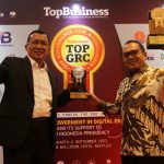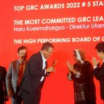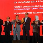 Direktur Utama PT Bank Tabungan Negara (Persero) Tbk., Haru Koesmahargyo (kiri) mengangkat piala bersama Direktur Human Capital, Compliance and Legal, Eko Waluyo usai menerima penghargaan di ajang TOP Governance Risk & Compliance 2022 di Jakarta, Selasa (6/9) . Dalam ajang ini, Bank BTN meraih 3 penghargaan yaitu TOP GRC 2022 5 Stars, The Most Committed GRC Leader 2022 for CEO & The High Performing Board of Commissioner on GRC 2022. Penghargaan ini adalah bukti bahwa BTN unggul dalam penerapan Good Corporate Governance, manajemen risiko, manajemen kepatuhan wujud dari implementasi Pilar Budaya Governance & Risk Culture yang digalakkan BTN.