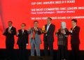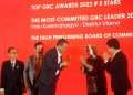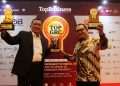 Direktur Utama PT Bank Tabungan Negara (Persero) Tbk., Haru Koesmahargyo (kiri) mengangkat piala bersama Direktur Human Capital, Compliance and Legal, Eko Waluyo usai menerima penghargaan di ajang TOP Governance Risk & Compliance 2022 di Jakarta, Selasa (6/9) . Dalam ajang ini, Bank BTN meraih 3 penghargaan yaitu TOP GRC 2022 5 Stars, The Most Committed GRC Leader 2022 for CEO & The High Performing Board of Commissioner on GRC 2022. Penghargaan ini adalah bukti bahwa BTN unggul dalam penerapan Good Corporate Governance, manajemen risiko, manajemen kepatuhan wujud dari implementasi Pilar Budaya Governance & Risk Culture yang digalakkan BTN.
