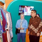 Direktur Sales & Distribution BSI Anton Sukarna berbincang dengan salah satu pengunjung Jakarta Muslim Fashion Week 2024 di ICE BSD yang digelar 19-22 Oktober 2023.