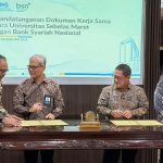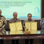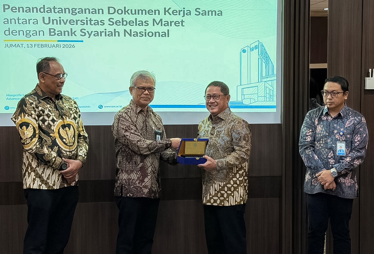 Direktur Utama Bank Syariah Nasional (BSN) Alex Sofjan Noor bersama Komisaris Utama BSN Bahrullah Akbar, Rektor UNS Prof Dr. Hartono, dr, MSI dan Wakil Rektor UNS Bidang Perencanaan, Kerjasama, Internasionalisasi dan Informasi Prof Irwan Trinugroho SE, MSC, PHD, QCRO berfoto bersama usai melakukan penandatanganan MOU terkait kerjasama pemanfaatan jasa dan layanan perbankan antara UNS dan BSN, di Surakarta, Jumat (13/2). Nota kesepahaman ini mempertegas langkah strategis BSN memperluas jangkauan bisnisnya ke sektor pendidikan tinggi sekaligus dalam rangka memperkuat literasi keuangan dan ekosistem syariah di lingkungan kampus. Perguruan Tinggi memiliki peran sentral dalam membangun ekosistem keluarga Indonesia sehingga tepat jika BSN sesuai visinya menjadikan kampus sebagai salah satu mitra utama keuangan keluarga Indonesia yang berkah dan amanah. Selain kolaborasi dalam pemanfaatan produk dan layanan perbankan secara institusi, dalam MOU tersebut juga menyasar program magang berdampak yang bertujuan untuk pengembangan talenta muda, pertukaran pengetahuan, pemanfaatan fasilitas bersama yang bermanfaat nyata bagi BSN maupun UNS.