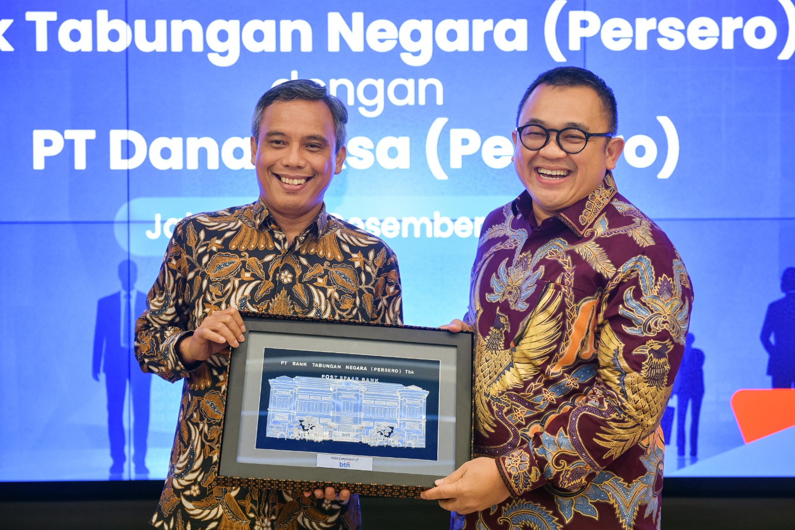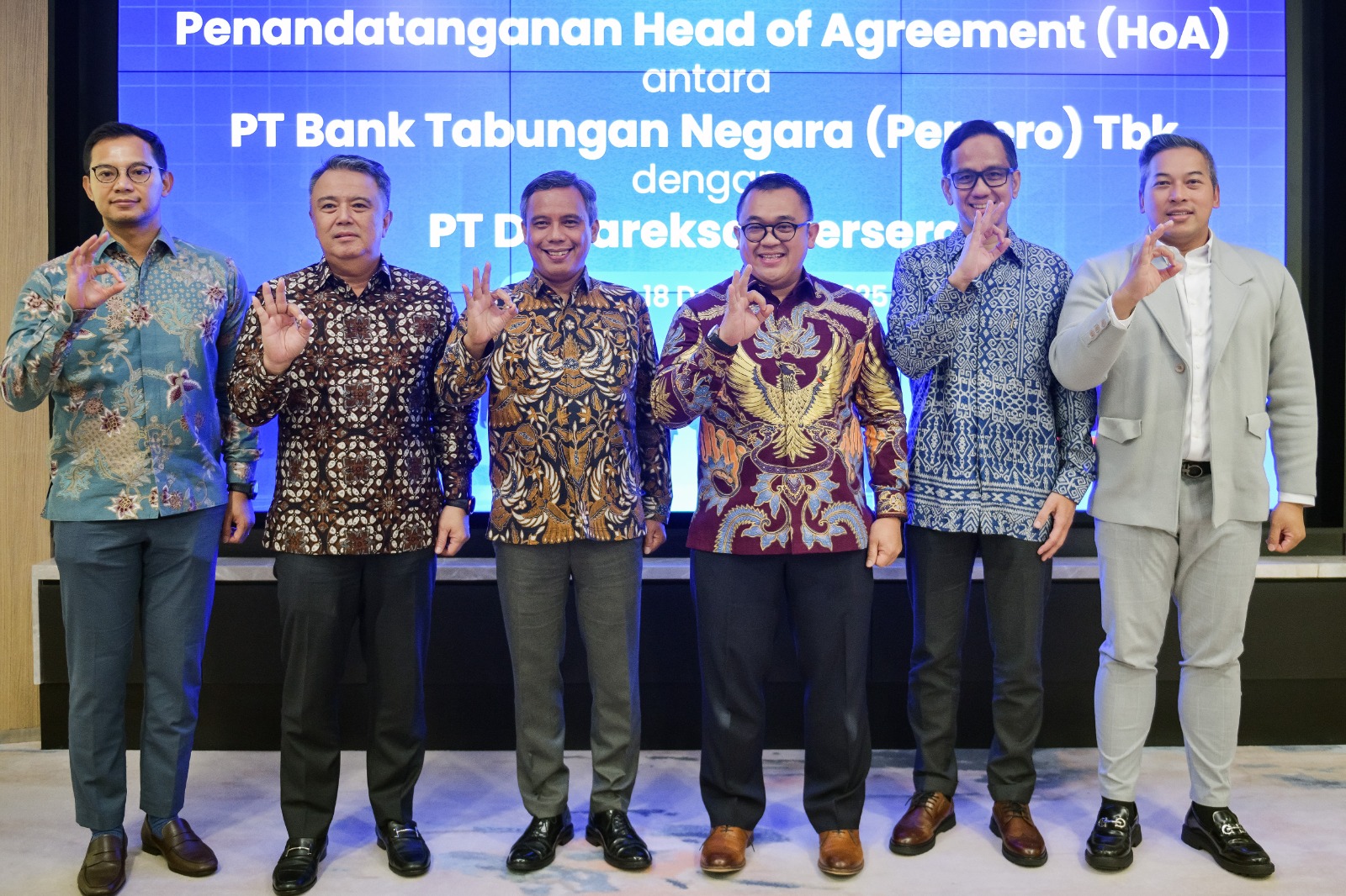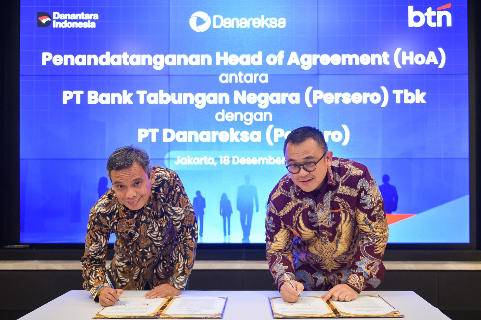 Direktur Utama PT Bank Tabungan Negara (Persero) Tbk, Nixon LP Napitupulu, dan Direktur Utama PT Danareksa (Persero), Yadi Jaya Ruchandi, menunjukkan dokumen Kesepakatan Pendahuluan (Head of Agreement/HoA) usai penandatanganan kerja sama strategis antara BTN dan Holding BUMN Danareksa di Menara 2 BTN, Jakarta, Kamis (18/12/m). Melalui kerja sama tersebut, BTN menyiapkan plafon fasilitas pembiayaan hingga Rp4,5 triliun yang terdiri dari Committed Corporate Line Facility dan Uncommitted Corporate Line Facility, serta menyediakan layanan perbankan terintegrasi untuk mendukung pengelolaan keuangan dan ekspansi bisnis seluruh ekosistem holding Danareksa. Kerja sama ini menjadi bagian dari upaya BTN untuk memperkuat perannya sebagai mitra perbankan utama bagi holding korporasi berskala besar, termasuk melalui pemanfaatan layanan cash management dan solusi perbankan digital melalui Bale Korpora.