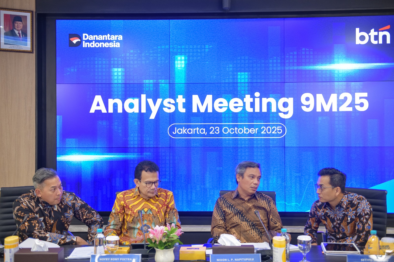 Direktur Utama PT Bank Tabungan Negara (Persero) Tbk Nixon LP Napitupulu (ketiga kiri) didampingi Direktur Network & Retail Funding BTN Rully Setiawan (kiri), Direktur Finance & Strategy BTN Nofry Rony Poetra (kedua kiri), Direktur Risk Management BTN Setiyo Wibowo (kedua kanan), dan SEVP Digital Business BTN Thomas Wahyudi (kanan) tersenyum melihat kinerja BTN per 30 September 2025 di Jakarta, Kamis (23/10). Pada kuartal III/2025, BTN berhasil membukukan laba bersih sebesar Rp2,3 triliun, bertumbuh double-digit sebesar 10,6% secara tahunan (yoy) dibandingkan periode yang sama tahun lalu sebesar Rp2,08 triliun. Kredit dan pembiayaan BTN pun tercatat tumbuh positif sebesar 7,0% yoy menjadi Rp381,03 triliun hingga kuartal III/2025. Meningkatnya kepercayaan masyarakat bertransaksi lewat BTN juga mendongkrak pertumbuhan DPK yang mencapai 16,0% yoy hingga kuartal III/2025, menjadi Rp429,92 triliun, dari posisi yang sama tahun lalu sebesar Rp370,75 triliun.