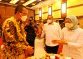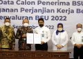 Menteri Ketenagakerjaan RI Ida Fauziah (kanan) berbincang-bincang dengan Direktur Utama PT Bank Tabungan Negara (Persero) Tbk, Haru Koesmahargyo (kiri) dan Wakil Menteri Ketenagakerjaan RI, Afriansyah Noor (tengah) di sela -sela acara Penandatanganan Perjanjian Kerjasama Penyaluran Bantuan berupa Subsidi Gaji/ UPAH bagi Pekerja/Buruh tahun Anggaran 2022 di Jakarta, Selasa (6/9). Bank BTN resmi menjadi salah satu bank penyalur Bantuan Subsidi UPAH (BSU). BTN berkomitmen mendistribusikan BSU sesuai ketentuan Pemerintah kepada pekerja yang memenuhi syarat sebagai penerima BSU.