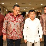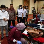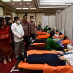 Ketua Umum Palang Merah Indonesia (PMI), M Jusuf Kalla (kedua dari kiri) didampingi Direktur Utama PT Bank Tabungan Negara (Persero) Tbk, Haru Koesmahargyo (kedua dari kanan) dan *Wakil* Sekjen Perbanas Rita Mirasari (kiri) dan Ketua Umum Ikatan Bankir Indonesia (IBI), Haryanto Budiman (kanan) meninjau pelaksanaan kegiatan donor darah di Menara BTN, Jakarta Pusat, Kamis (29/9). Bank BTN bekerjasama dengan IBI, Perhimpunan Bank Nasional (PERBANAS) dan Bankers Association for Risk Management (BARa) mendukung kegiatan sosial yang digalang PMI dengan menggelar acara donor darah yang diikuti oleh kurang lebih 300 pegawai di lingkungan Kantor Pusat Bank BTN.