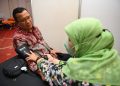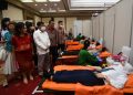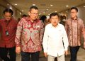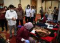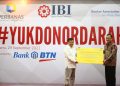 Ketua Umum Palang Merah Indonesia (PMI), M Jusuf Kalla (kedua dari kiri) didampingi Direktur Utama PT Bank Tabungan Negara (Persero) Tbk, Haru Koesmahargyo (kedua dari kanan) dan *Wakil* Sekjen Perbanas Rita Mirasari (kiri) dan Ketua Umum Ikatan Bankir Indonesia (IBI), Haryanto Budiman (kanan) meninjau pelaksanaan kegiatan donor darah di Menara BTN, Jakarta Pusat, Kamis (29/9). Bank BTN bekerjasama dengan IBI, Perhimpunan Bank Nasional (PERBANAS) dan Bankers Association for Risk Management (BARa) mendukung kegiatan sosial yang digalang PMI dengan menggelar acara donor darah yang diikuti oleh kurang lebih 300 pegawai di lingkungan Kantor Pusat Bank BTN.