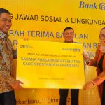 Direktur Consumer Bank BTN Hirwandi Gafar bersama Anggota Komisi VI DPR Jon Erizal secara simbolis memberikan bantuan Tanggung Jawab Sosial dan Lingkungan (TJSL) berupa sarana kesehatan kepada 51 Posyandu dan Beasiswa Pendidikan untuk kader Posyandu di Pekanbaru, Riau, Selasa (11/10). Bantuan TJSL ini merupakan bukti komitmen Bank BTN dalam mendukung pembangunan berkelanjutan untuk menjamin kehidupan yang sehat dan meningkatkan kesejahteraan masyarakat.