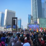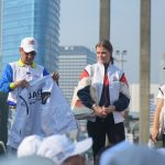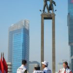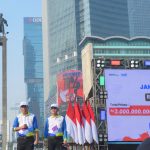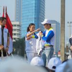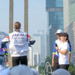 PJ Gubernur Gubernur DKI Heru Budi Hartono saat menyematkan Rompi BTN Jakarta International Maratahon 2024 (JAKIM) kepada Mantan Puteri Indonesia 2002 Melanie Putria Dewita Sari dalam rangkaian acara Pencanangan HUT DKI Jakarta ke-497 di Bundaran Hotel Indonesia Jakarta, Minggu (19/05/2024). BTN JAKIM 2024 yang akan digelar 23 Juni 2024 akan dimeriahkan oleh lebih dari 50 cheering seni kebudayaan sepanjang rute yang dilalui oleh para pelari.