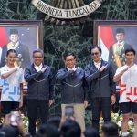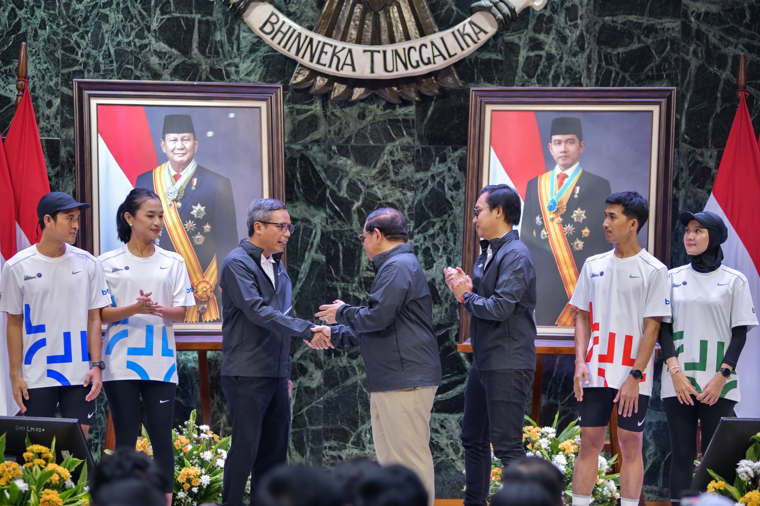 Gubernur DKI Jakarta Pramono Anung (keempat kiri) bersama Direktur Utama PT Bank Tabungan Negara (Persero) Tbk Nixon LP Napitupulu (ketiga kiri) dan Race Director Indonesia Muda Road Runner Satrio Guardian (ketiga kanan) kompak tersenyum sambil menunjukkan pose tangan melesat dalam Konferensi Pers BTN JAKIM 2026 di Balai Kota DKI Jakarta, Selasa (14/4). Penyelenggaraan BTN Jakarta International Marathon (JAKIM) 2026 hasil kolaborasi Pemerintah Provinsi DKI Jakarta dengan BTN ditargetkan bakal memberikan dampak perputaran ekonomi mencapai sekitar Rp200 miliar atau naik Rp125 miliar dibandingkan tahun lau. Hal ini sejalan dengan peningkatan masif baik dari sisi skala, kuantitas peserta, maupun kualitas penyelenggaraan.