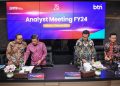 Direktur Utama BTN Nixon LP Napitupulu berbincang dengan Direktur Finance BTN Nofry Rony Poetra, Direktur Risk Management BTN Setiyo Wibowo dan Direktur IT BTN Andi Nirwoto pada saat Analyst Meeting Kinerja Keuangan BTN Tahun 2024 di Jakarta, Selasa (11/2). PT Bank Tabungan Negara (Persero) Tbk (BTN) optimistis hingga akhir tahun 2025 aset perseroan bakal tembus Rp500 triliun. Hal ini seiring dengan perolehan aset BTN hingga akhir 2024 yang sebesar Rp469,61 triliun yang naik 7% dibandingkan tahun 2023 yang sebesar Rp438,75 triliun. Adapun sepanjang tahun 2024, BTN berhasil membukukan penyaluran kredit dan pembiayaan sebesar Rp357,97 triliun atau tumbuh sebesar 7,3% secara tahunan (year-on-year/yoy) dibandingkan periode yang sama tahun 2023 sebesar Rp333,69 triliun.