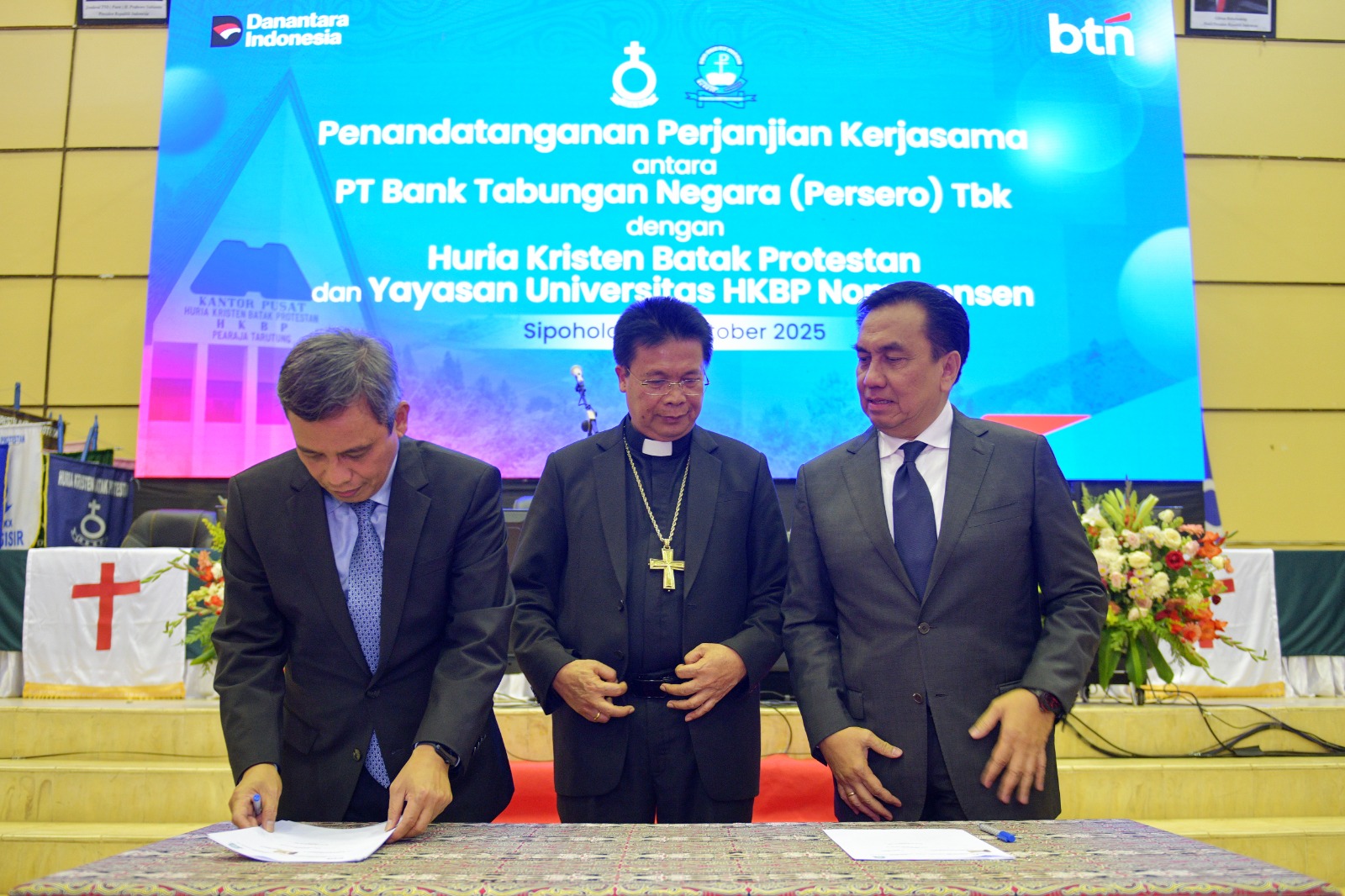 Simbolon, Direktur Network & Retail Funding BTN Rully Setiawan, Direktur Information Technology BTN Tan Jacky Chen, dan Direktur Commercial Banking BTN Hermita saat peluncuran Tabungan BTN-HKBP di Auditorium HKBP Seminarium Sipoholon, Tapanuli Utara (Taput), Sumatera Utara, Selasa (28/10/2025). Peluncuran Tabungan BTN–HKBP ini selain untuk mendukung kegiataan keagamaan, diharapkan bisa meningkatkan perolehan dana murah perseroan. Potensi pengumpulan dana murah dari Tabungan BTN-HKBP ini sangat besar, dikarenakan jumlah jemaat HKBP saat ini mencapai 6,5 juta orang yang menjadikan HKBP organisasi gereja terbesar di Indonesia dan Asia Tenggara.