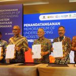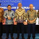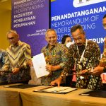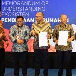 Direktur Jenderal Pembiayaan Infrastruktur Pekerjaan Umum dan Perumahan Kementerian PUPR Herry Trisaputra Zuna (ketiga kiri), Direktur Jenderal Kekayaan Negara Kementerian Keuangan Rionald Silaban (kedua kiri), Komisioner BP Tapera Adi Setianto (kedua kanan), Direktur Utama PT Bank Tabungan Negara (Persero) Tbk. Haru Koesmahargyo, dan Direktur Utama PT Sarana Multigriya Finansial Ananta Wiyogo (kiri) kompak tersenyum sambil memamerkan naskah nota kesepahaman dan komitmen bersama dalam acara Penandatanganan Memorandum of Understanding (MoU) Ekosistem Pembiayaan Perumahan di Jakarta, Rabu (25/1). Penandatanganan MoU dan komitmen bersama tersebut menjadi penanda terbentuknya Sekretariat Ekosistem Pembiayaan Perumahan. Sekretariat ini akan mendukung program pemerintah untuk memaksimalkan penyediaan pembiayaan rumah rakyat khususnya bagi masyarakat berpenghasilan rendah dalam rangka mencapai zero backlog pada 2045.