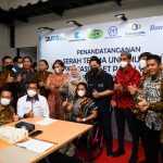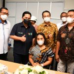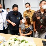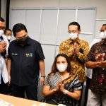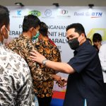 Menteri BUMN Erick Thohir bersama Direktur Utama Bank BTN Haru Koesmahargyo berbincang dengan para atlit paralimpic usai menyaksikan serah terima unit hunian di Jakarta, Sabtu (2/4). Menteri BUMN melalui Bank BTN selaku koordinator dan 4 BUMN Donatur masing-masing PT Krakatau Steel, PT Pembangunan Perumahan, PT Kawasan Berikat Nusantara dan PT Asuransi IndonesiaRe memberikan apresiasi kepada 9 atlit juara paralimpic di Tokyo tahun lalu. Adapun masing-masing atlit tersebut diberikan satu unit apartemen full furnish dan free IPL selama satu tahun di apartemen Mahatta Semesta Depok yang sudah menerapkan konsep TOD atau transit oriented development.