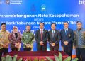 Simbolon memperlihatkan naskah MOU disaksikan Ompui Ephorus HKBP , Pdt. Dr. Victor Tinambunan, MST, Direktur Network & Retail Funding BTN Rully Setiawan, Direktur Commercial Banking BTN Hermita dan SEVP Digital Business BTN Thomas Wahyudi usai menandatangani Nota Kesepahaman (MOU) antara BTN dengan Huria Kristen Bataka Protestan (HKBP) dan Yayasan Universitas HKBP Nomensen di Medan, Sumater Utara, Selasa (26/8).