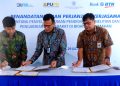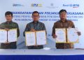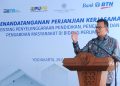 Direktur Finance PT Bank Tabungan Negara (Persero) Tbk. Nofry Rony Poetra (tengah) bersama Dekan Fakultas Teknik Universitas Gadjah Mada (FT UGM) Selo (kiri) dan Kepala Balai Pelaksana Penyediaan Perumahan Jawa III Direktorat Jenderal Perumahan Kementerian PUPR Salahudin Rasyidi (kanan) memamerkan naskah Perjanjian Kerja Sama (PKS) tentang Penyelenggaraan Pendidikan, Penelitian, dan Pengabdian Masyarakat di Bidang Perumahan di Yogyakarta, Jumat (29/7). Bank BTN, Kementerian PUPR, dan FT UGM berkolaborasi mendukung inisiasi Klinik Rumah Swadaya (KRS) di kawasan perguruan tinggi UGM. Melalui klinik tersebut, masyarakat yang ingin membangun rumah secara mandiri bisa mendapatkan layanan informasi dan pendampingan secara gratis. Informasi dan pendampingan yang diberikan mulai dari desain rumah, kebutuhan biaya, perizinan, hingga proses pembangunan.