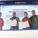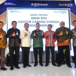 Direktur Consumer PT Bank Tabungan Negara (Persero) Tbk. Hirwandi Gafar (kedua kiri), Kepala Kantor Cabang Syariah Bank BTN Bandar Lampung Bayu Dwi Haryanto (kiri), Asisten Perekonomian dan Pembangunan Kota Bandar Lampung Tole Dailami (kedua kanan), dan Asisten Perekonomian dan Pembangunan Provinsi Lampung Kusnadi (kanan) tersenyum sebelum menggunting pita dalam pembukaan Kantor Cabang Syariah Bank BTN Bandar Lampung di Bandar Lampung, Rabu (18/1). Mengawali tahun 2023, BTN Syariah semakin ekspansif melakukan perluasan usaha untuk menggarap potensi bisnis pembiayaan syariah dan mendukung pemerintah dalam meningkatkan ekosistem syariah yang kini makin diminati masyarakat. Perluasan jaringan kantor syariah tersebut juga untuk mempermudah masyarakat Lampung memiliki rumah dengan pembiayaan syariah.
