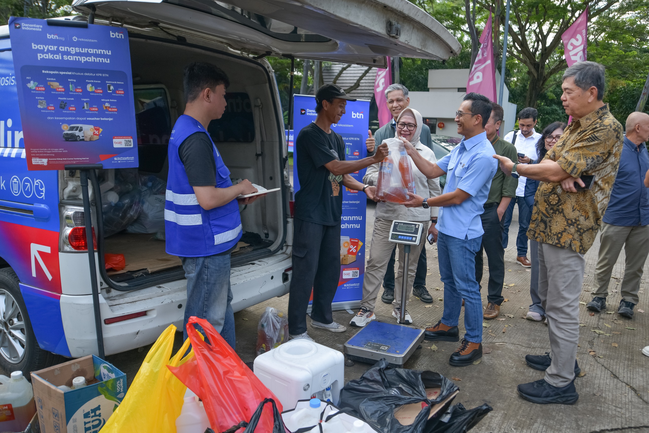 (kedua kanan) berbincang di salah satu rumah rendah emisi yang dibiayai BTN di Mutiara Gading City, Bekasi, Rabu (4/2). Hingga akhir 2025, BTN telah menyalurkan pembiayaan untuk pembangunan 11.000 rumah rendah emisi dari berbagai developer di berbagai daerah, contohnya Legok, Cileungsi, Medan, Semarang, Cirebon, dan Bekasi. Tahun ini perseroan menargetkan membiayai 20.000 unit rumah rendah emisi. Sampai tahun 2030, BTN membidik akan membiayai 200.000 unit karena rumah merupakan salah satu penyumbang terbesar emisi.