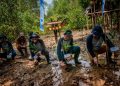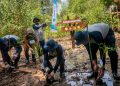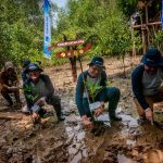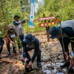 Direktur PT Chandra Asri Petrochemical Tbk, Edi Rivai (tengah) bersama Sekretaris Daerah Kabupaten Pandeglang Taufik Hidayat (kiri), Asda Ekonomi-Pembangunan Kabupaten Pandeglang Kurnia Satriawan (kanan) beserta jajaran Kepala Dinas Kabupaten Pandeglang secara simbolis melakukan penanaman bibit mangrove untuk meresmikan Kawasan Edu-Ekowisata Mangrove Patikang yang berlokasi di Desa Citereup, Kabupaten Pandeglang, Banten, Selasa (30/8). Berkolaborasi dengan pemangkukepentingan, Chandra Asri mengembangkan kawasan Edu-Ekowisata Mangrove seluas 9.500 m2 untuk memaksimal blue carbon sebagai bagian dari proses dekarbonisasi yang sejalan dengan komitmen Perseroan terhadap prinsip Environmental, Social and Governance (ESG) dan mewujudkan Net Zero Emission di Indonesia. Kontribusi tersebut meliputi pembangunan trek sepanjang 179 meter dengan memanfaatkan limbah non B3 berupa palet kayu bekas, menyumbangkan perahu Kano sebagai fasilitas untuk berkeliling kawasan, dan melakukan studi untuk menentukan intervensi dalam menjaga ekologi mangrove.