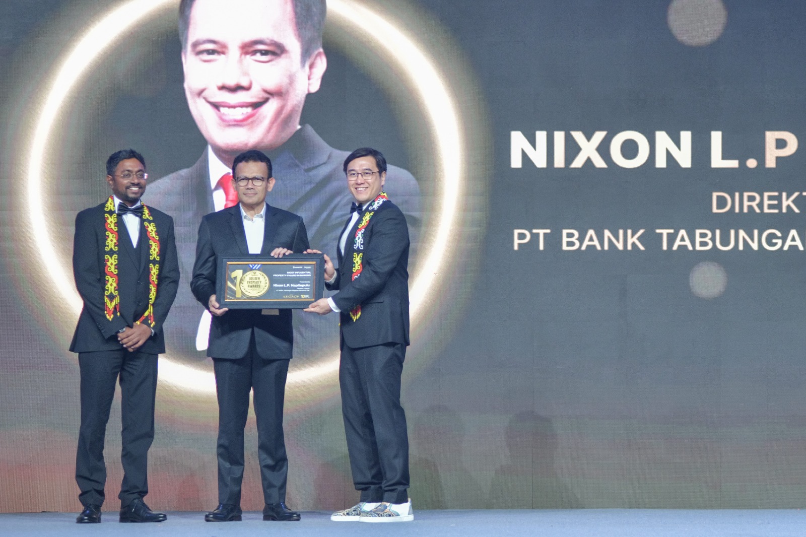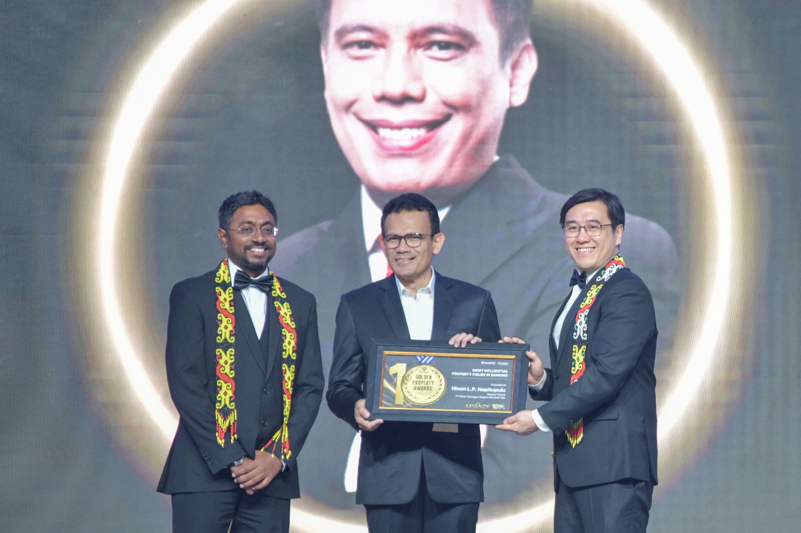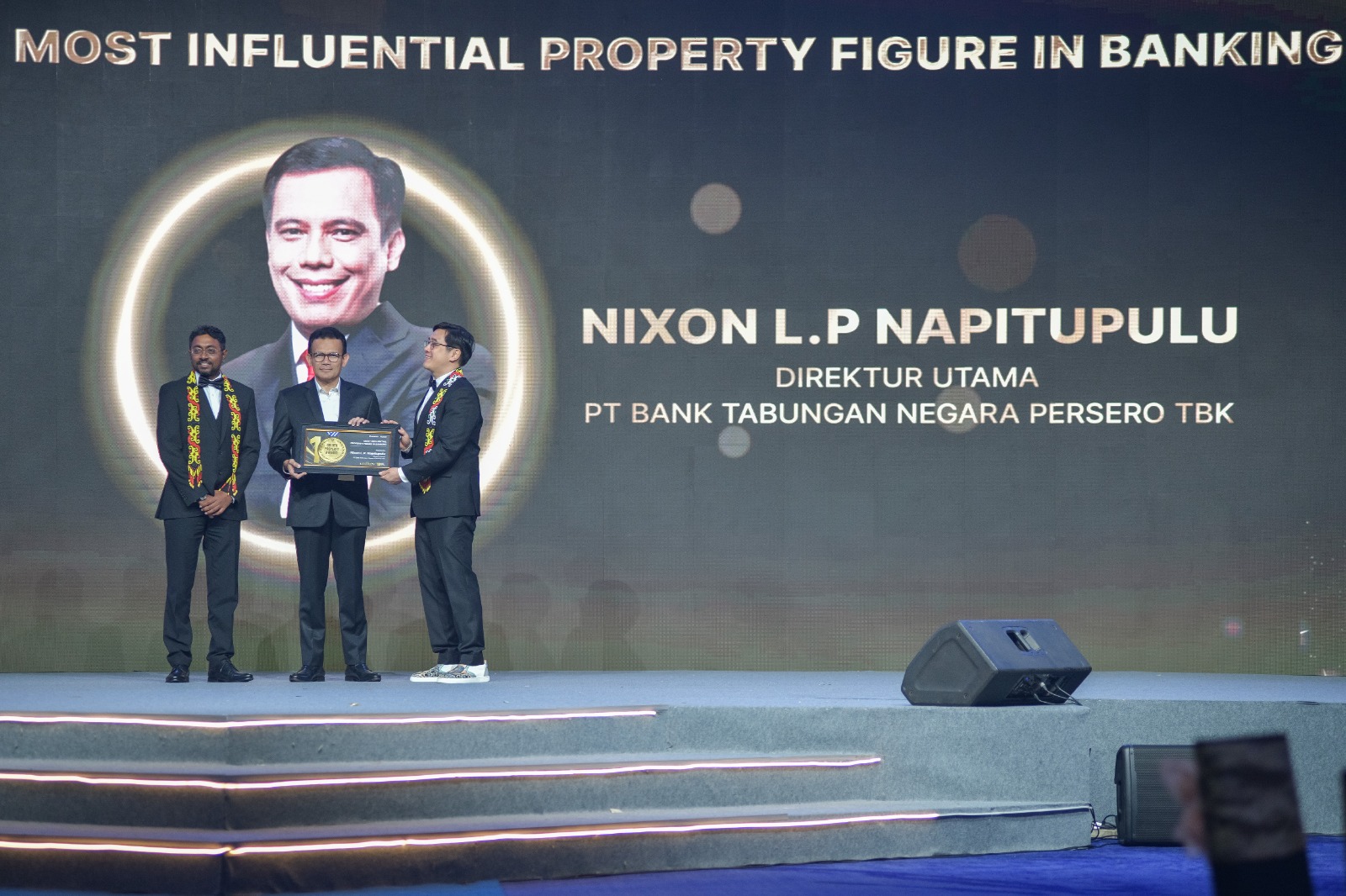 Direktur Finance & Strategy PT Bank Tabungan Negara (Persero) Tbk, Nofry Rony Poetra (tengah), mewakili Direktur Utama BTN Nixon LP Napitupulu menerima penghargaan Most Influential Property Figure in Banking pada ajang Golden Property Awards 2025 yang digelar di Jakarta, Senin (29/9/2025). Penghargaan bergengsi ini menegaskan posisi Nixon LP Napitupulu sebagai Direktur Utama BTN merupakan sosok yang paling berpengaruh dalam mendukung pembiayaan perumahan dan pengembangan sektor properti nasional.