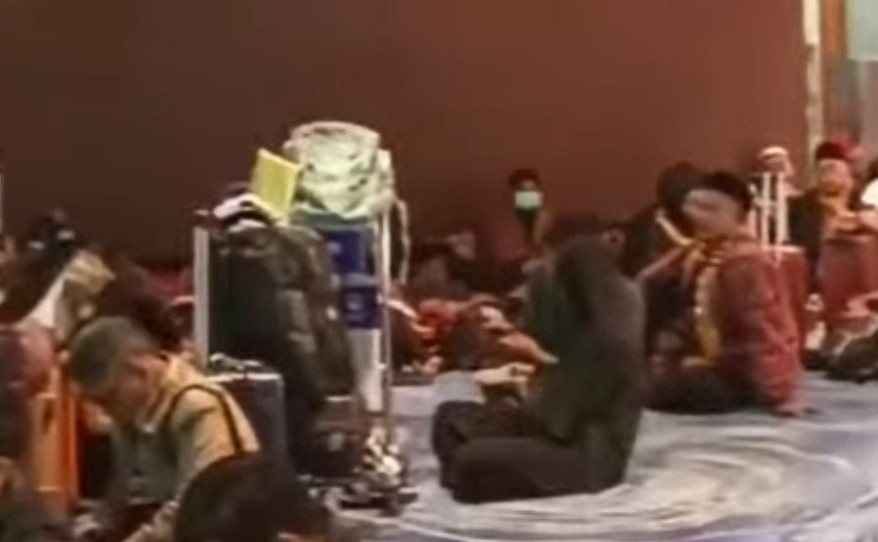 Dalam tayangan itu, terlihat para calon penumpang terpaksa duduk di lantai area tunggu, sementara layar informasi penerbangan menampilkan status pembatalan untuk rute menuju Jeddah.