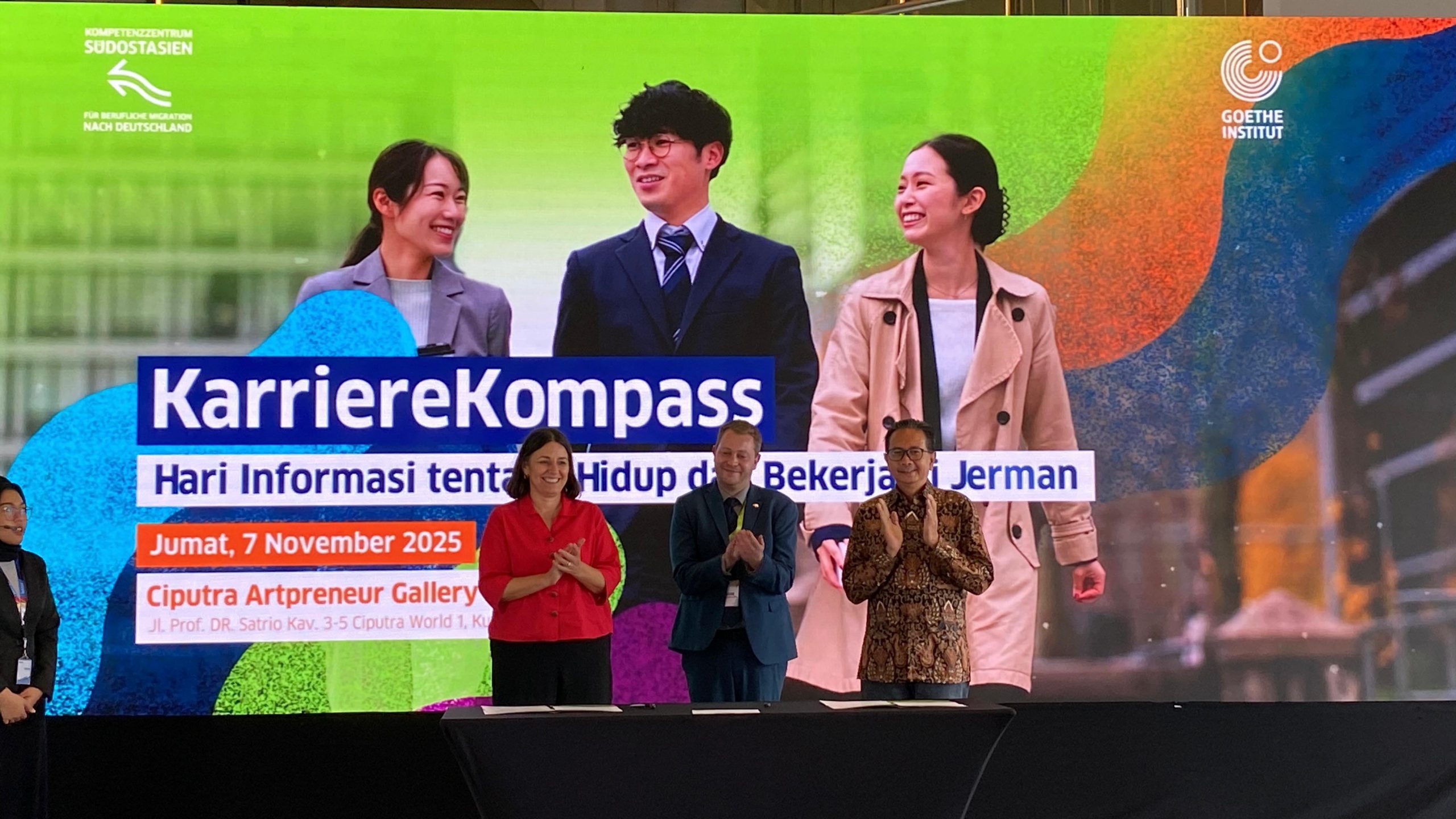 Penandatanganan nota kesepahaman (MoU) dilakukan pada pembukaan acara KarriereKompass di Ciputra Artpreneur Gallery, Jumat (7/11/2025). MoU ditandatangani oleh Direktur Goethe-Institut Wilayah Asia Tenggara, Australia, dan Selandia Baru, Constanze Michel, bersama Direktur ASTRAtech, Henri Paul, dan turut disaksikan oleh Sekretaris Pertama Bidang Ekonomi Kedutaan Besar Jerman di Indonesia, Jonas Präfke.