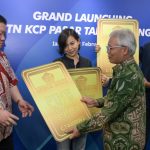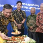 Direktur Utama BTN Nixon LP Napitupulu disaksikan Direktur Distribution & Funding BTN Jasmin dan Kepala BTN Kantor Wilayah (Kanwil) 2 DKI-Banten Iriska Dewayani memberikan potongan tumpeng kepada nasabah BTN Rasyad Pandhega dalam acara Grand Launching BTN KCP Pasar Tanah Abang Blok A di Jakarta, Kamis (22/2). Pembukaan KCP Pasar Tanah Abang Blok A merupakan langkah BTN untuk memenuhi kebutuhan transaksi perbankan para pedagang Pasar Tanah Abang Blok A. BTN berharap bisa meningkatkan brand awareness bagi nasabah terutama pedagang dan pengunjung melalui akuisisi product holding baik dari potensi bisnis ritel dan kredit UMKM di lingkungan Pasar Tanah Abang.