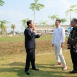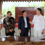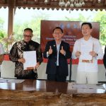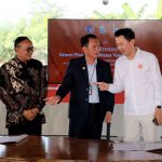 Chief Bussines Officer PT. Bank Hibank Indonesia Rudy Gomedi (kedua kanan) bersama Direktur Utama PT. NBF Tirta Sejahtera dan PT. Bintang Mahameru Sejahtera Saipul Anwar (kedua kiri), disaksikan Bupati Kabupaten Bekasi Dani Ramdan (tengah), Direktur Utama Perumda Tirta Bhagasasi Reza Lutfi (kanan), dan Direktur Utama Perumda Tirta Patriot Ali Imam Fariadi (kiri) menunjukkan nota kesepakatan kerja sama di Metland, Kabupaten Bekasi, Jawa Barat, Senin (29/7/2024). PT Bank Hibank Indonesia bekerja sama dengan PT Bintang Mahameru Sejahtera, PT NBF Tirta Sejahtera, dan Perusahaan Umum Daerah (PERUMDA) mendukung Green Financing memberikan pembiayaan pembangunan proyek Water Treatment Plant di Bekasi yang bertujuan untuk menyediakan akses air bersih bagi masyarakat.