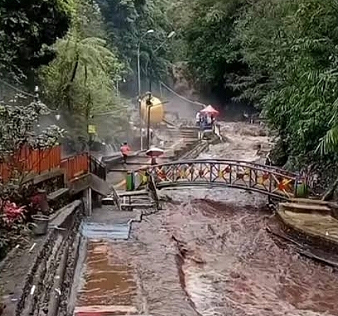 “Curah hujan tinggi menyebabkan aliran sungai meluap dan menerjang kawasan wisata Guci,” ujar Bergas dalam keterangannya.