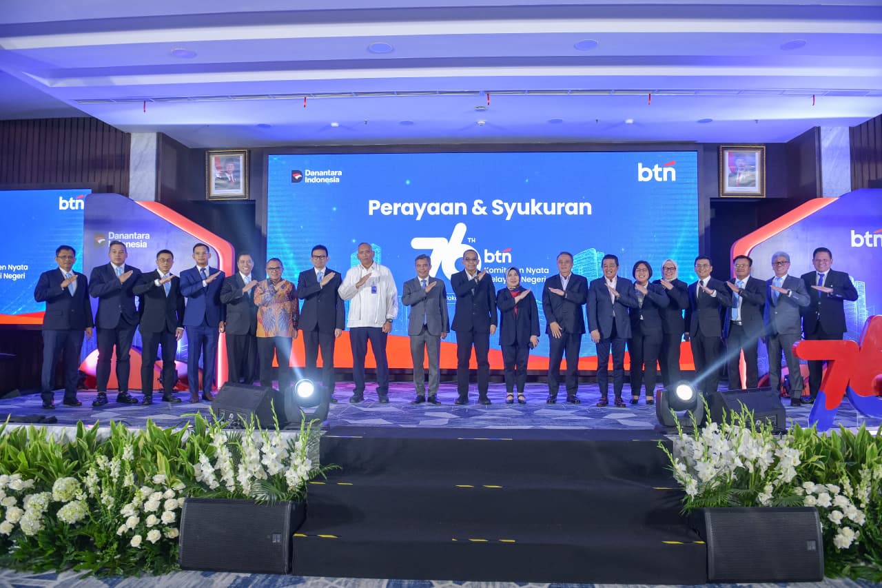 Direktur Utama PT Bank Tabungan Negara (Persero) Tbk (BTN) Nixon LP Napitupulu (tengah) bersama Komisaris Utama BTN Suryo Utomo (dua dari kiri) dan Wakil Direktur Utama BTN Oni Febriarto Rahardjo (dua dari kanan) melakukan prosesi potong tumpeng dalam rangka Perayaan dan Syukuran Hari Ulang Tahun (HUT) BTN ke-76 di Ballroom Menara 1 BTN, Jakarta. Dalam usia yang ke-76 tahun, BTN menegaskan komitmen sebagai Mitra Utama Pemberdayaan Finansial Keluarga Indonesia melalui transformasi layanan yang semakin digital, terintegrasi, dan relevan dengan kebutuhan masyarakat modern.