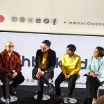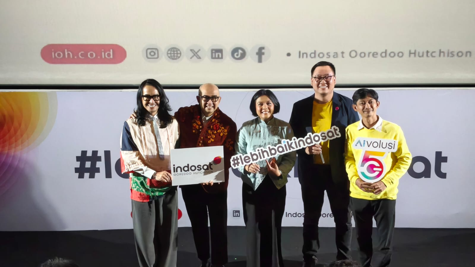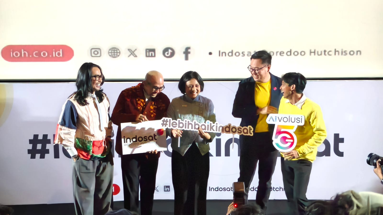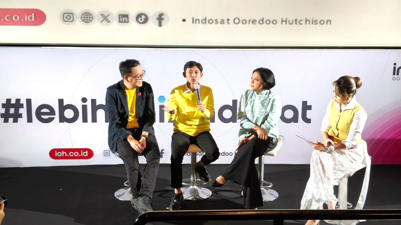 (ki-ka) Dave Hendrik & Iwet Ramadhan Creative Duo Personalities, Ovidia Nomia SVP-Head of Corporate Communications, Raden Tofan SVP-Head of Network Operations dan Yono Bakrie Stand-up Comedian saat Peluncuran #LebihBaikIndosat yang berlangsung di Jakarta, Jumat (20/2). Mengusung semangat You Only Need One (YONO), Indosat percaya bahwa di momen-momen terpenting, masyarakat hanya membutuhkan satu hal yang benar-benar bisa diandalkan: satu koneksi yang kuat, satu inovasi yang membantu, dan satu aksi nyata yang berdampak. Inilah makna #LebihBaikIndosat di Ramadan tahun ini.