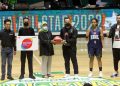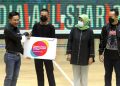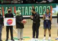 Director & Chief Human Resources Indosat Ooredoo Hutchison Irsyad Sahroni (kiri) secara simbolis menyerahkan bantuan kepada Kapten Tim Basket SMKN 53 Jakarta Barat Rahmat Hidayat (kedua kiri) disaksikan Wakil Kepala Sekolah Kesiswaan SMKN 53 Jakarta Barat Nuzulurrofiah (ketiga kanan) dan Direktur Utama Indonesian Basketball League/IBL Junas Miradiarsyah (kedua kanan) saat meluncurkan program pelatihan talenta basket ke Sekolah saat IBL All Star 2022 di Hall Basket Senayan, Jakarta, Kamis (31/3/2022). Indosat Ooredoo Hutchison (IOH) meluncurkan program pelatihan talenta basket ke sekolah yang bertujuan untuk pemberdayaan generasi muda dan talenta olahraga terbaik Indonesia dibidang bola basket.