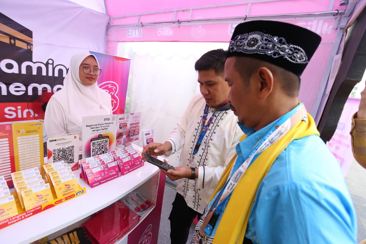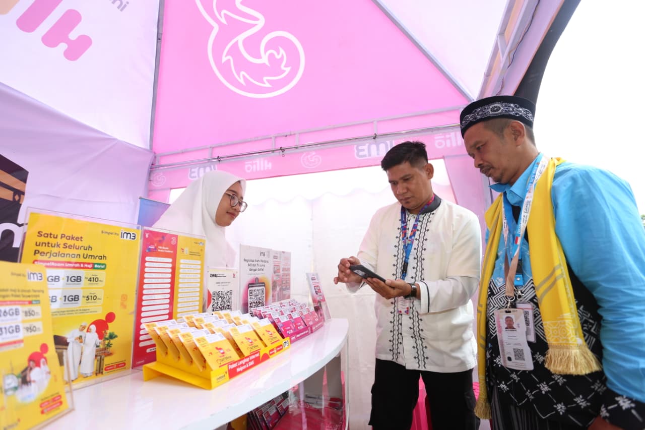 SVP Head of Region Inner Jakarta Indosat Shatya Framudia (kiri), SVP Head of High Value Growth Indosat Essy Prita Cinta (kanan) saat melakukan kunjungan ke titik layanan yang berada di Asrama Haji Bekasi, Kamis (23/4). Indosat menyiapkan titik layanan untuk jamaah Haji di area Jakarta Raya (JAYA) — mencakup Jabodetabek, Banten hingga Jawa Barat — berlokasi di Asrama Haji Pondok Gede, Cipondoh, Bekasi dan Indramayu berlangsung sejak 21 April hingga 9 Mei. Indosat melalui brand IM3 dan Tri menyediakan paket roaming sesuai dengan kebutuhan pelanggan agar perjalanan Ibadah Haji lebih tenang.