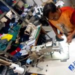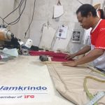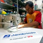 Pekerja sedang menjahit Jersey olahraga di Jakarta, Minggu (23/6)