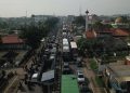 Kendaraan terjebak kemacetan di kawasan Simpang Jomin, Kabupaten Karawang, Jawa Barat, Jumat (29/4/2022). Kemacetan terjadi pada jalur Pantura menuju Jakarta imbas berlakunya One Way dan Ganjil Genap Mulai Berlaku di Tol Jakarta-Cikampek.
