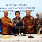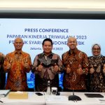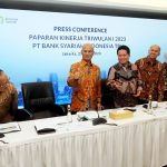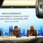 (Ki-ka) : Direktur Utama PT Bank Syariah Indonesia Tbk (BSI) Hery Gunardi (tengah) bersama dengan Direktur Information Technology BSI Achmad Syafii, Direktur Retail Banking BSI Ngatari, Direktur Finance & Strategy BSI Ade Cahyo Nugroho, Direktur Risk Management BSI Tiwul Widyastuti dan Direktur Compliance & Human Capital BSI Tribuana Tunggadewi saat paparan kinerja perseroan. Jakarta, 27 April 2023. PT Bank Syariah Indonesia Tbk (BSI) membukukan kinerja yang impresif sepanjang kuartal I/2023 dengan perolehan laba bersih mencapai Rp1,46 triliun, tumbuh dua digit 47,65% secara year on year. Kemampuan BSI memperkuat fungsi intermediasi melalui penghimpunan dana masyarakat dan penyaluran pembiayaan telah mendorong pertumbuhan positif kinerja perseroan.