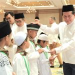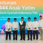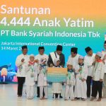 (Ki-ka). Ketua Dewan Pengawas Syariah BSI Hasanudin, Komisaris Utama BSI Muliaman D Hadad, Menteri Agama RI Nasarudin Umar, Direktur Utama BSI Hery Gunardi, Wakil Utama BSI Bob T Ananta dan Wakil Komisaris Utama BSI Adiwarman Karim (paling kanan) saat simbolis pemberian santunan kepada perwakilan anak yatim di JCC Senayan Jakarta, Jumat (14/03). PT Bank Syariah Indonesia Tbk (BSI) memberikan santunan kepada 4.444 anak yatim sebagai bentuk syukur perseroan atas kinerja tahun lalu yang solid dan tumbuh di atas rerata industri.