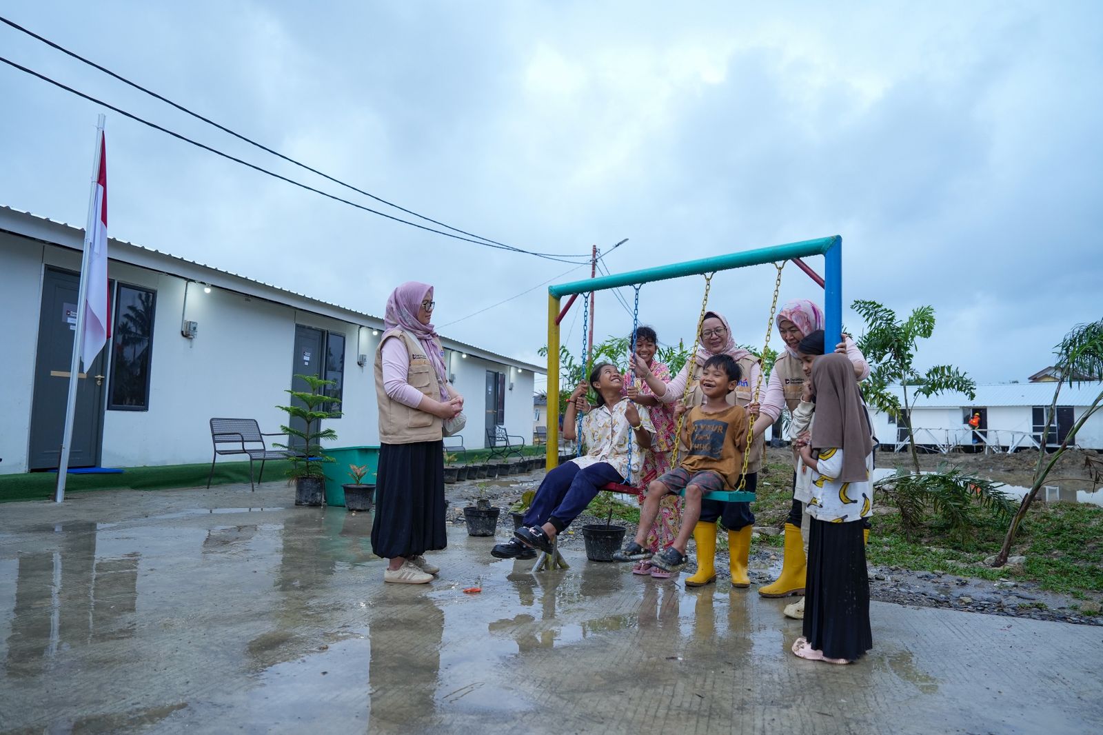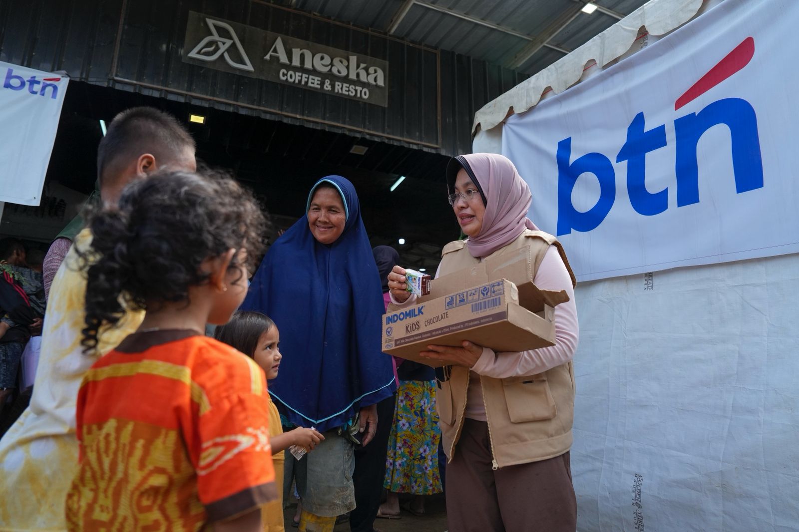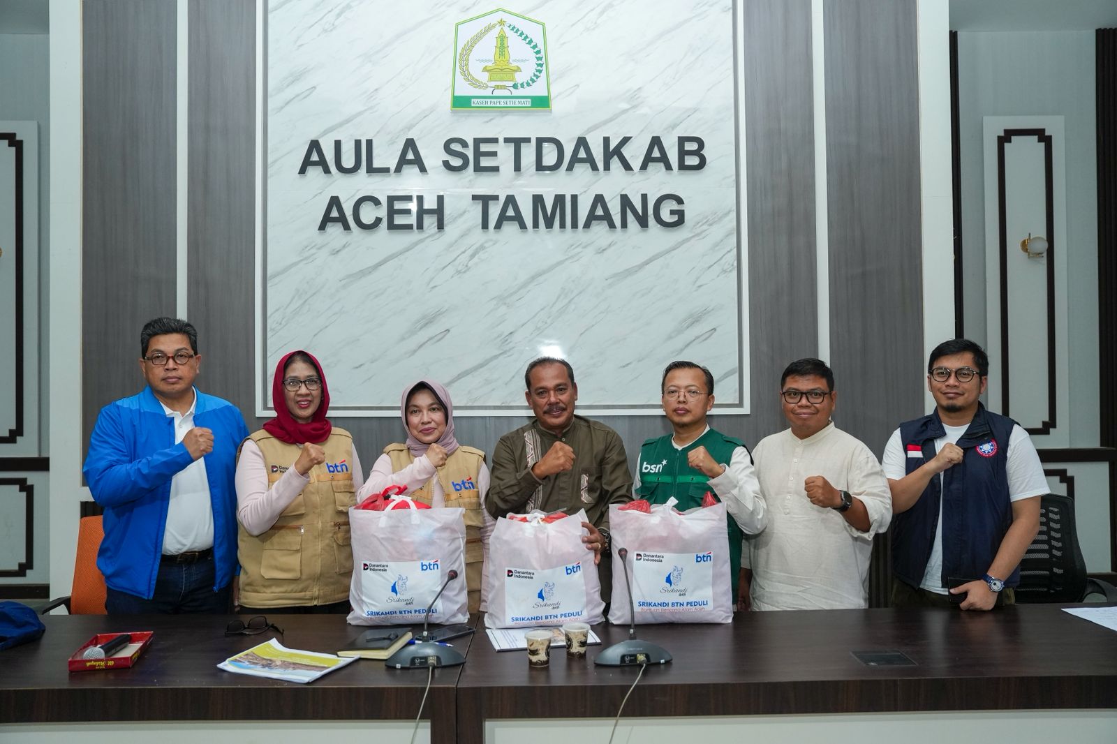 (Ki-ka) Direktur Utama PT Binasentra Purna Iriska Dewayani, Ketua Yayasan Kesejahteraan Pegawai PT Bank Tabungan Negara (Persero) Tbk Kusumarjono, Sekertaris Srikandi BTN Yenny Herlina, Wakil Ketua Srikandi BTN Laloria N Pardede, Ketua Serikat Pekerja BTN Rizky Novriady, Ketua Srikandi BTN Rahmayati, Direktur Utama Dapen BTN Elisabeth Novie Riswanti, dan Bendahara Srikandi BTN Adee Indriana Dwinandari (kanan) kompak tersenyum usai membagikan bantuan bagi para ibu dan anak korban bencana di Aceh Tamiang, Jumat (9/1). Para ibu dan pekerja perempuan di BTN yang tergabung dalam Srikandi BTN berkolaborasi bersama Dana Pensiun BTN, Yayasan Kesejahteraan Pegawai BTN, dan Serikat Pekerja BTN memberikan ratusan paket kebutuhan dasar, perlengkapan ibadah, makanan tambahan balita, mainan anak serta pengiriman truk tangki air dan dukungan air bersih jangka panjang melalui penyediaan sumur bor. Bantuan tersebut disalurkan melalui Pemerintah Kabupaten Aceh Tamiang juga disampaikan langsung melalui posko BTN. Selain mendistribusikan bantuan fisik, para pegawai BTN tersebut juga menyempatkan diri untuk berbagi cerita, memberikan dukungan emosional, dan menghibur anak-anak di lokasi pengungsian agar tetap ceria di tengah masa pemulihan ini.