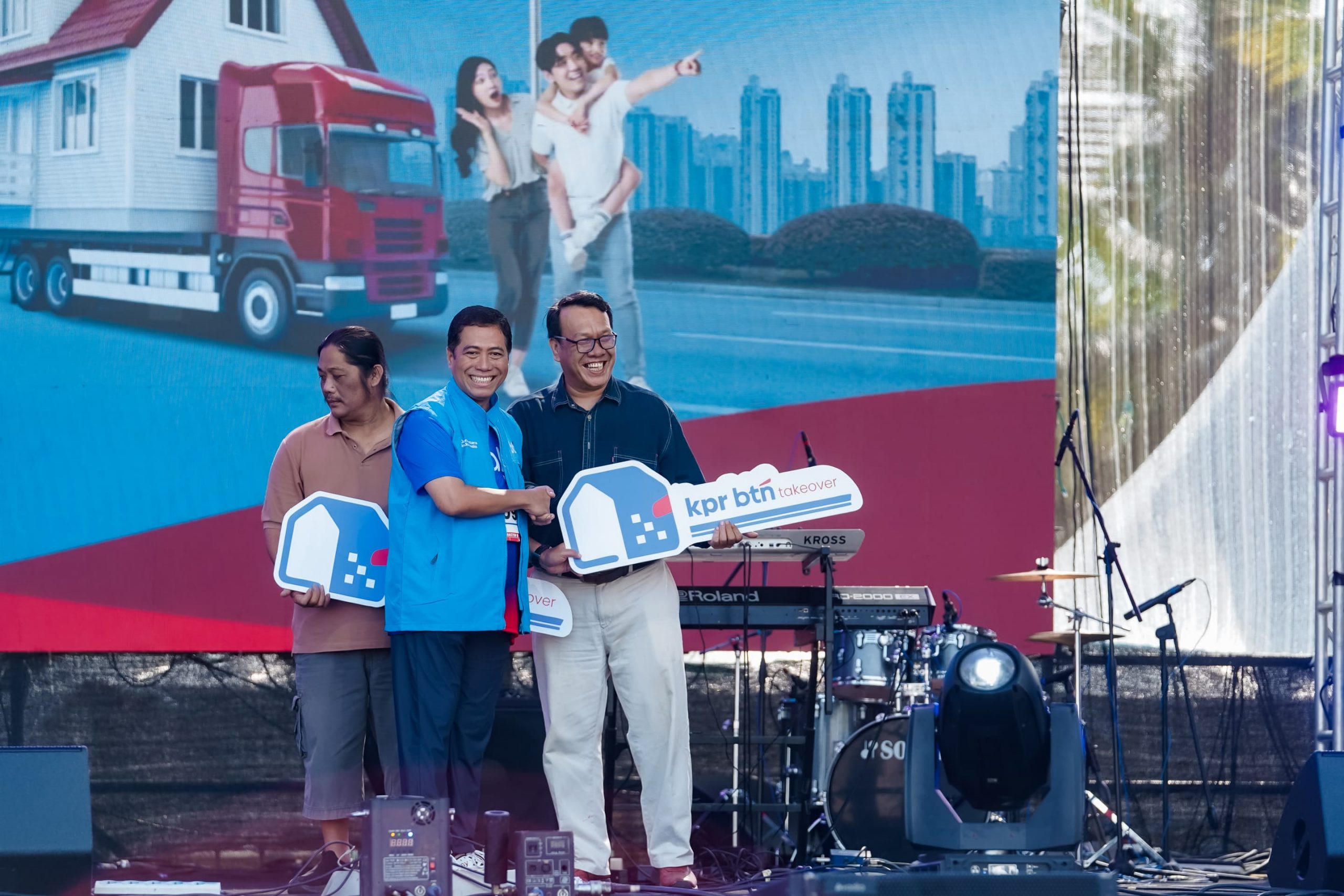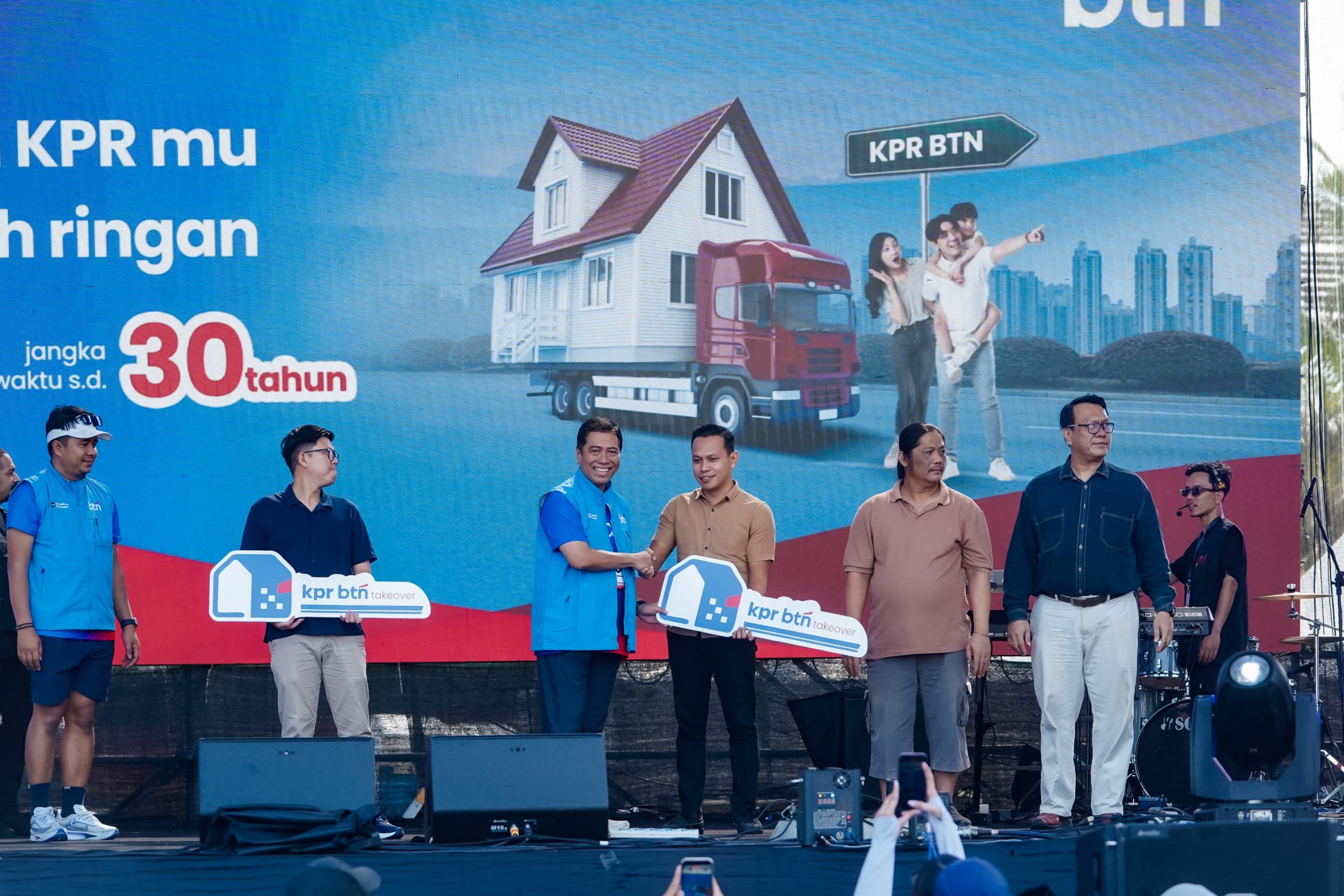 Direktur Consumer Banking PT Bank Tabungan Negara (Persero) Tbk (BTN) Hirwandi Gafar (tengah) secara simbolis menyerahkan mock up kunci rumah kepada debitur KPR BTN Take Over didampingi Kepala Divisi Mortgage & Secured Loan Division (MSLD) Bagus Hadriansyah (kiri) dalam rangkaian BTN Run 2026 for Charity di Beach City International Stadium (BCIS) Ancol, Jakarta (29/3). Melalui skema KPR BTN Take Over, debitur dapat memindahkan kredit perumahannya dari bank lain ke BTN dengan suku bunga kompetitif sebesar 2,65% fixed selama 3 tahun. Sehingga memberikan keringanan cicilan bagi debitur.