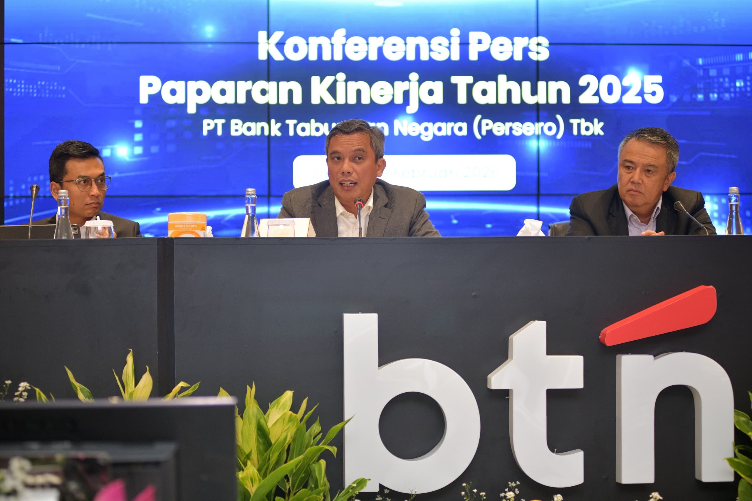 Direktur Utama PT Bank Tabungan Negara (Persero) Tbk (BTN) Nixon LP Napitupulu (tengah) bersama Wakil Direktur Utama BTN Oni Febriarto Rahardjo (ketiga dari kanan), Direktur Network and Retail Funding BTN Rully Setiawan (paling kanan), Direktur Finance and Strategy BTN Nofry Rony Poetra (kedua dari kanan), Direktur Risk Management BTN Setiyo Wibowo (ketiga dari kiri), Direktur Consumer Banking BTN Hirwandi Gafar (kedua dari kiri), serta SEVP Digital Business BTN Thomas Wahyudi (paling kiri) saat konferensi pers Paparan Kinerja BTN Tahun 2025 di Ruang Postpaar, Menara 1 BTN, Jakarta, Senin (9/2). Memasuki usia ke-76 tahun, BTN mencatatkan laba bersih konsolidasian sebesar Rp3,5 triliun sepanjang 2025, tumbuh double digit 16,4% secara year-on-year (yoy), dengan total aset konsolidasian mencapai Rp527,8 triliun atau meningkat 12,4% yoy.