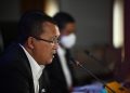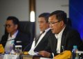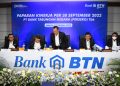 Direktur Utama Bank BTN Haru Koesmahargyo, Wakil Direktur Utama Bank BTN Nixon LP Napitupulu, Direktur Consuner Bank BTN Hirwandi Gafar, Direktur Finance Bank BTN Nofry Rony Poetra dan Direktur Risk Management Bank BTN Setiyo Wibowo berbincang di sela Paparan Kinerja Keuangan Kuartal III/2022 Bank BTN di Jakarta, Kamis (27/10). Sepanjang Januari hingga September 2022 Bank BTN berhasil membukukan kinerja gemilang dengan meraih kenaikan laba bersih sebesar 50,11% menjadi Rp2,28 triliun dibanding periode yang sama tahun sebelumnya senilai Rp1,51 triliun. Adapun kenaikan laba bersih perseroan, ditopang oleh keberhasilan Bank BTN menjalankan inisiatif strategis di kuartal III/2022 antara lain peningkatan penyaluran kredit, biaya dana (cost of fund) yang berhasil ditekan seiring dengan peningkatan penghimpunan dana murah ditambah juga dengan suksesnya Bank BTN melakukan perbaikan rasio kredit bermasalah (non performing loan) yang terus menurun hingga akhir September 2022.